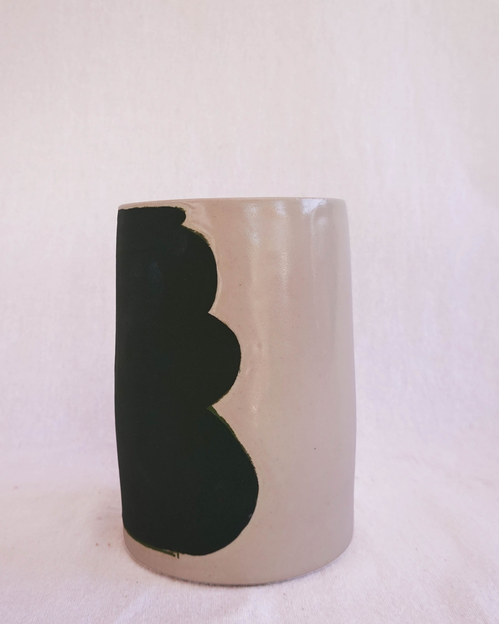 Tall cylindrical vase with a fun sketch of a curvy vase! Blush glaze with a satin finish on exterior and interior, with a matte green vase sketch and lighter green glaze chalk outlines.