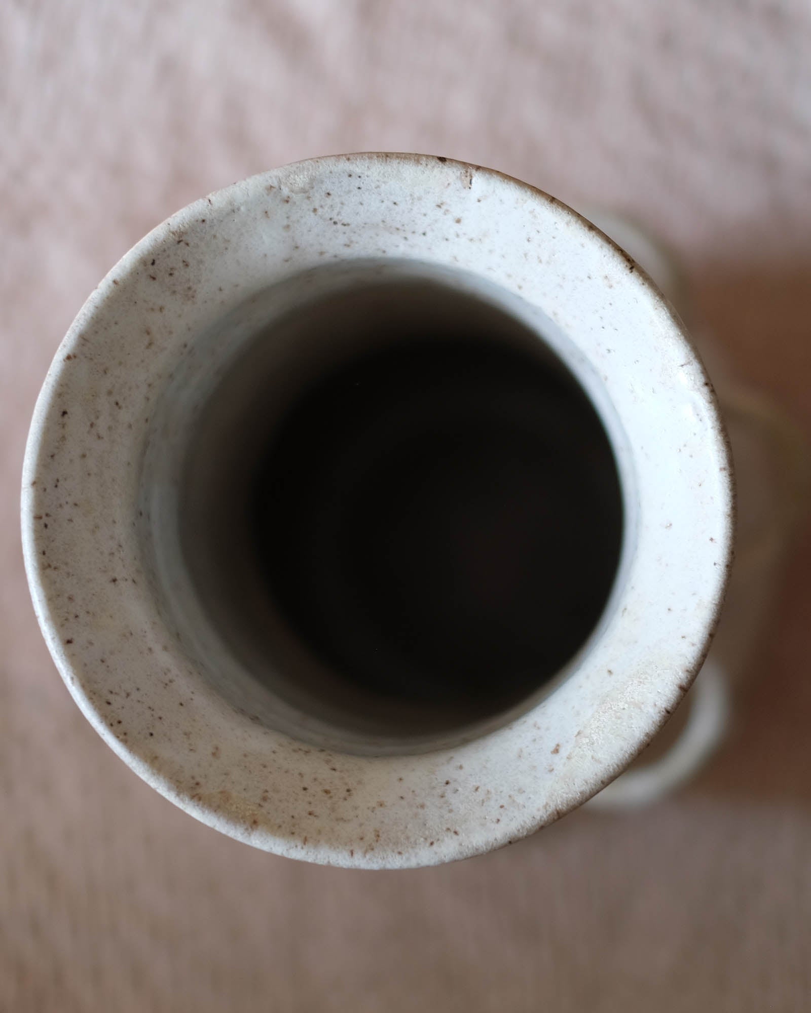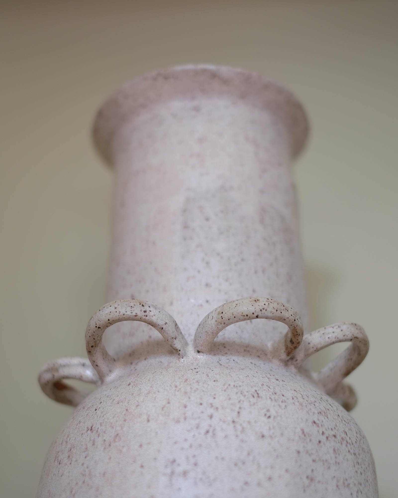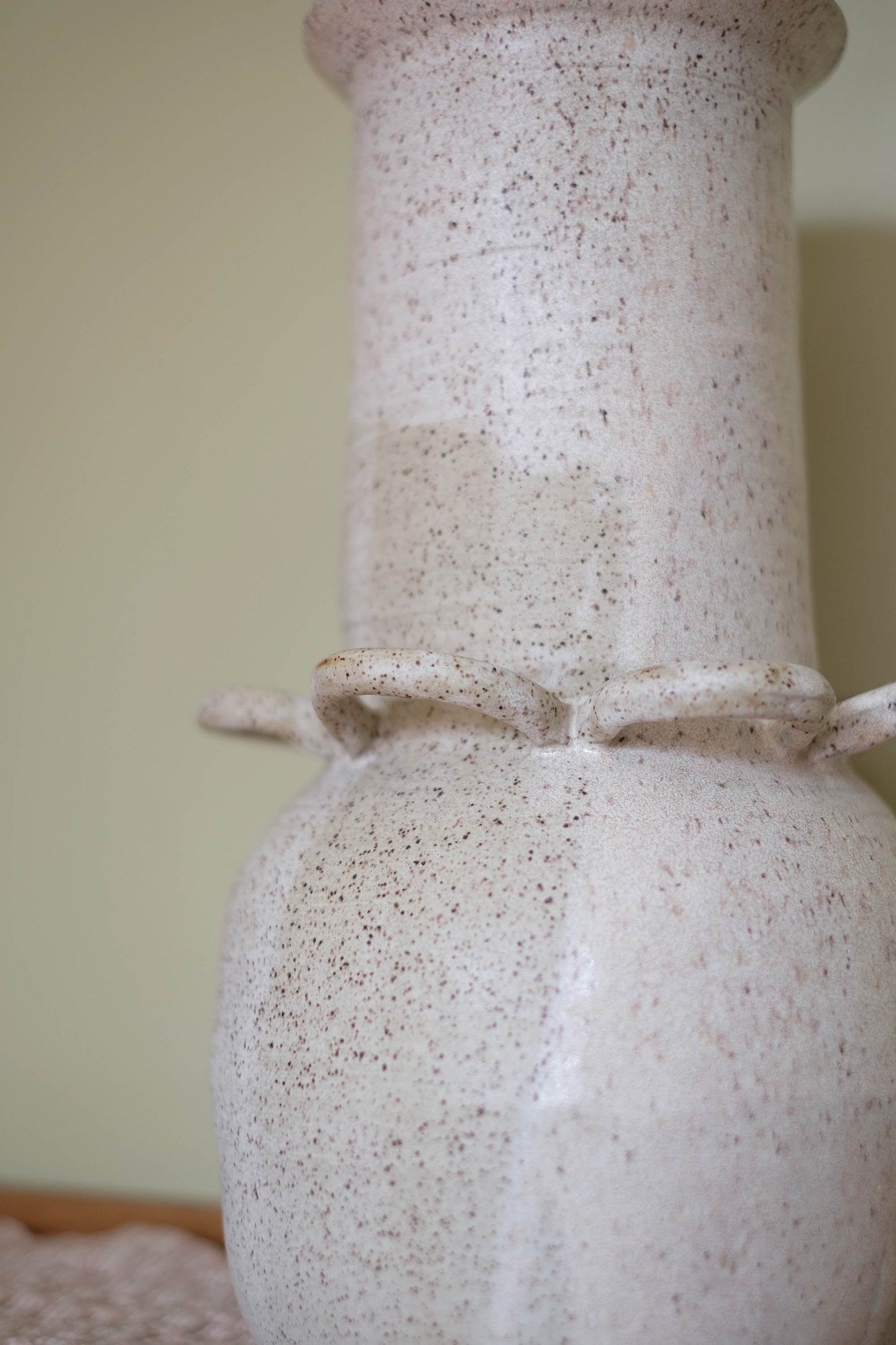 Very tall sculptural vase, a combination of wheel-thrown and handbuilt! Creamy white speckled glaze with variations of opacity throughout. Seven loops form a ring around the neck of the vase, the lip flares out slightly up top. This pieces is watertight and functions as a vase, but makes a beautiful display piece as well.