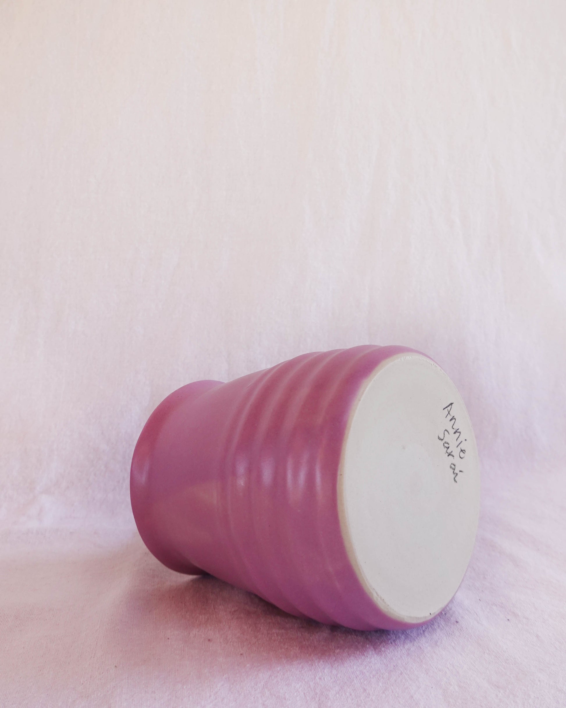 Tapered vase with rippled details and flared rim. Glazed in a bright lilac smooth glaze over a white clay.