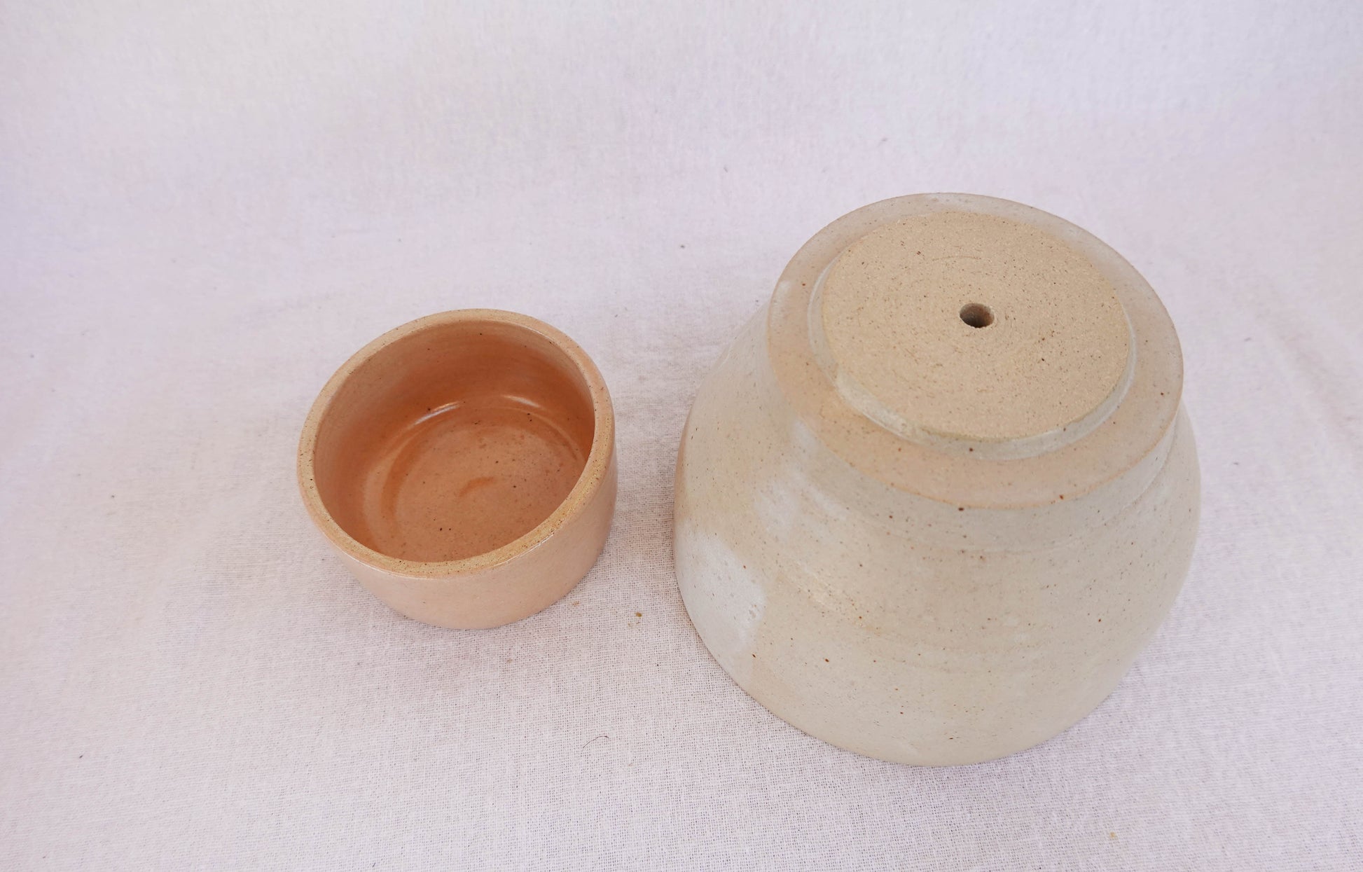Awesome planter in two tones. planter section has a drainage hole and sits on top of a compartment for water to drain into. Glazed in a creamy white and blush pink.